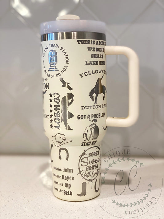 40oz Engraved Yellowstone Themed Tumbler With Handle, Lid, & Straw