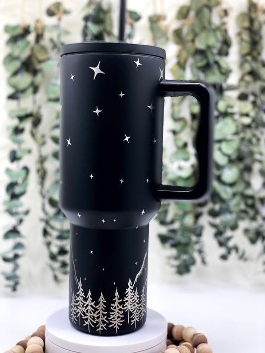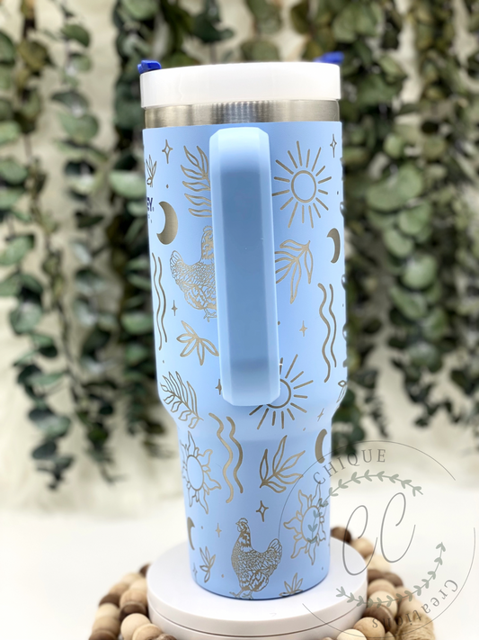 Laser Engraved Boho Plants, Suns, & Chickens Tumbler With Handle, Stanley